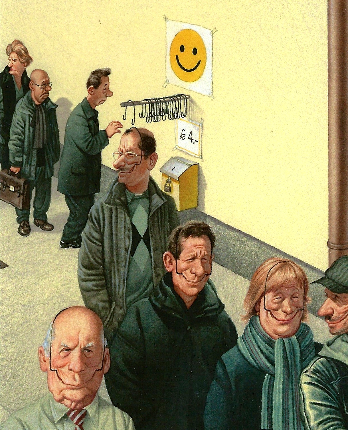 Als je jezelf niet kietelt, lach je nooit? Misschien heb je integendeel de lach wel aan je kont hangen, en is het altijd lachen, gieren, brullen. Of ben je meestal die lachende derde, of liever steevast de laatste, want die lacht het best. Maar of het nu de slappe is of de homerische, de sardonische of de satanische lach: het zal altijd schreien zijn met het ene oog & lachen met het andere. Lachen in jezelf, in je baard of in je vuistje, of als de duivel tegen de dageraad, als een geit op een zinken dak, als een boer die kiespijn heeft: het lachen mag ons niet vergaan. Maar lachende mondekes, bijtende hondekes: lachen moet je leren, schreien komt vanzelf. En anders, lach je niet langer een aap, een bult of een beroerte: koop zo’n haak, en je hoeft er geen spier meer voor te verrekken. Zelfs die vijftien niet versus de meer dan honderd spieren die nodig zijn om te huilen.