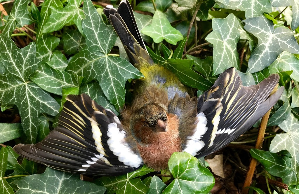 En daar lag je dan plots: vinkje, gods klein pinkje. Met gespreide vleugeltjes op een bedje van klimop. Nog maar juist voorbij de hongersnood, en nu ineens op vinkenslag dood. Te pletter gevlogen tegen het gepantserde raam van de veranda, van waarachter wij jou -behendig zwierend boven de dagelijkse aanvoer van gepelde zonnebloempitten- de hele winter verrukt hadden gadegeslagen.