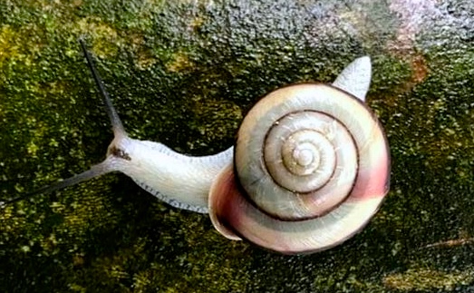 Hier is ze dan: trage Mie Slak. Zich langzaam voortslepend onder haar huisje dat momenteel net iets te zwaar lijkt te wegen, want niezend & proestend, kniezend & hoestend alsof ze een lading zout over zich heen heeft gekregen. Niettemin de natte voelhorentjes bestoven met het geparfumeerde stuifmeel van de Blauweregen, want er staat een gouden cirkel rondom de dag van vandaag.