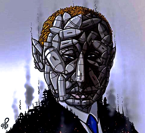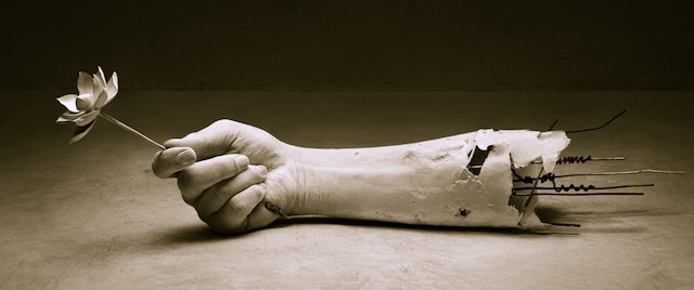 Het spreekt alleszins tot de verbeelding. Zo gepantserd die torso, zo kwetsbaar dat aanraakbare gelaat. Die onpeilbare blik van die pantserman, versus die weerloze hand die zowel het onverzoenlijke als het onmogelijke heel even probeert aan te raken. De rest laat zich raden, of blijft voorgoed onbeantwoord?