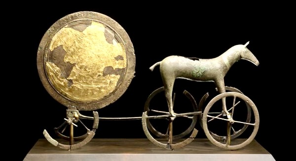 Deze beroemde Zonnewagen van Trundholm werd in 1902 door een boer op het Deense eiland Seeland tijdens het ploegen uit de grond gehaald. Gedateerd rond 1400 voor Christus, uit de eerste metaaltijd dus, thans in het Kopenhaagse Nationaal Museum.