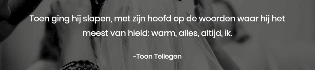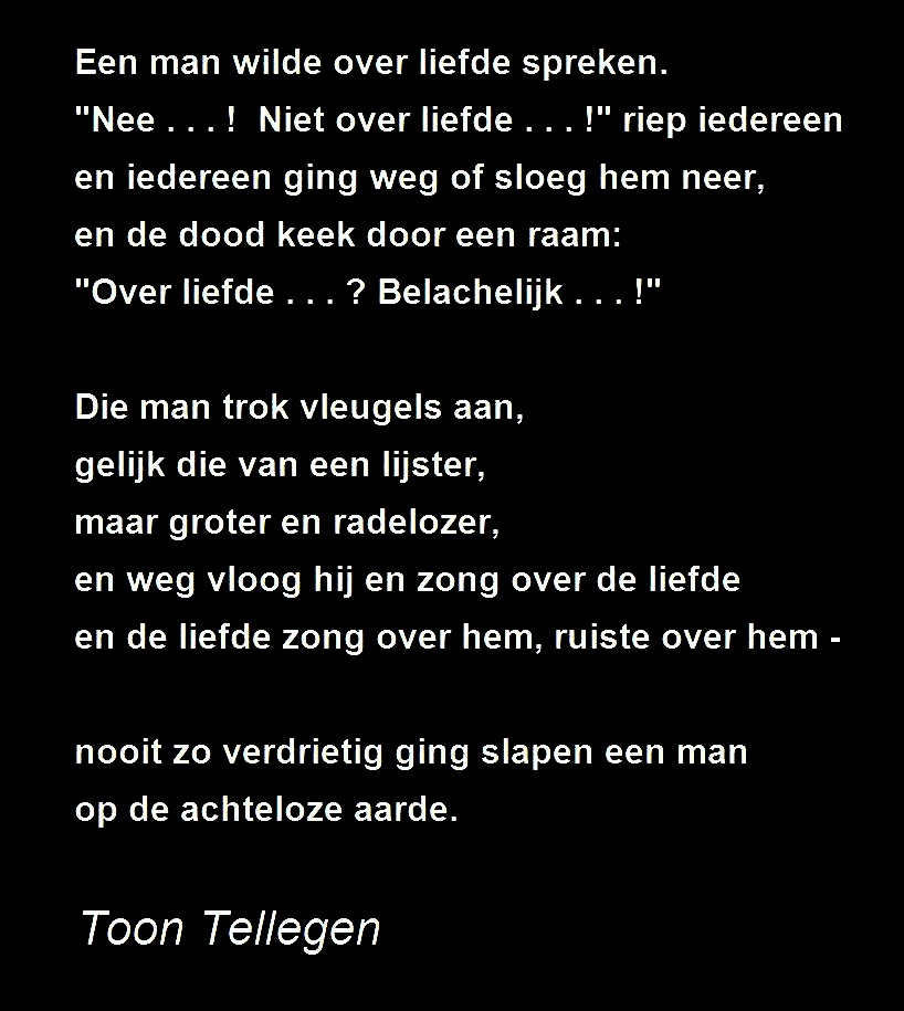 Waarom hangen zijn prachtige verzen niet als wapperende vanen in de bomen? Nooit nog vergeet ik zijn dichterlijke naam, want niet alleen voor wie hij lief heeft zal hij heten, maar volgens mij ook voor iédereen die hem te lezen krijgt.
