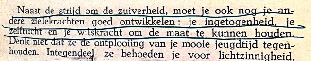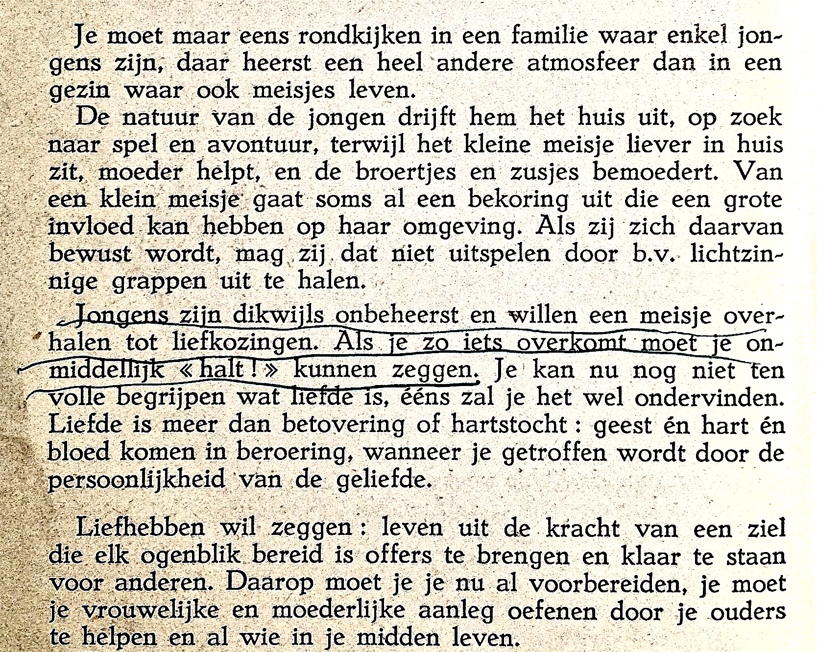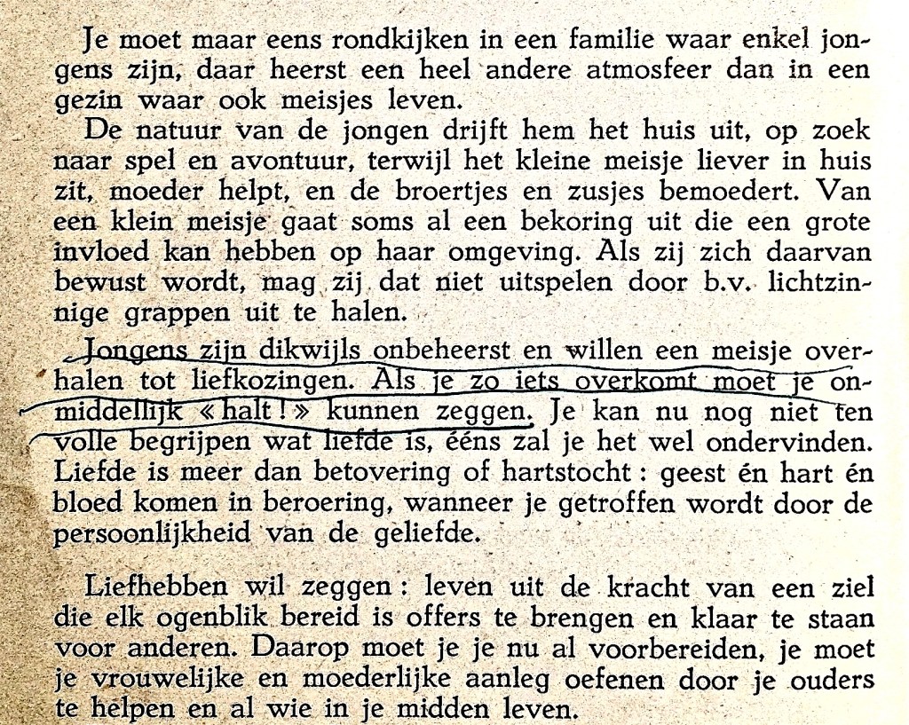 Het enige wat ik er van onthouden heb, omdat ik het toen zo onthutsend vond, zie mijn onderlijningen: dat het over zonde ging, over genot & (blijkbaar ongewenste) prikkelingen. Over onbeheerste jongens die meisjes wilden overhalen tot liefkozingen, en over dat akelige ‘Halt!’ kunnen roepen, want wat een benauwende opdracht was me dat?