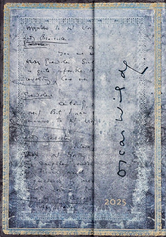 Gezwicht voor zijn fluisterblauwe aanblik. Alsook voor de verzilverde achterkant, waarop Oscar Wilde er – als uit de nevelen van de tijd – voor rugdekking zorgt. Daar viel niet aan te weerstaan. Mijn nieuwe agenda van Paperblanks, met ruimte voor een dagelijkse reflectie.