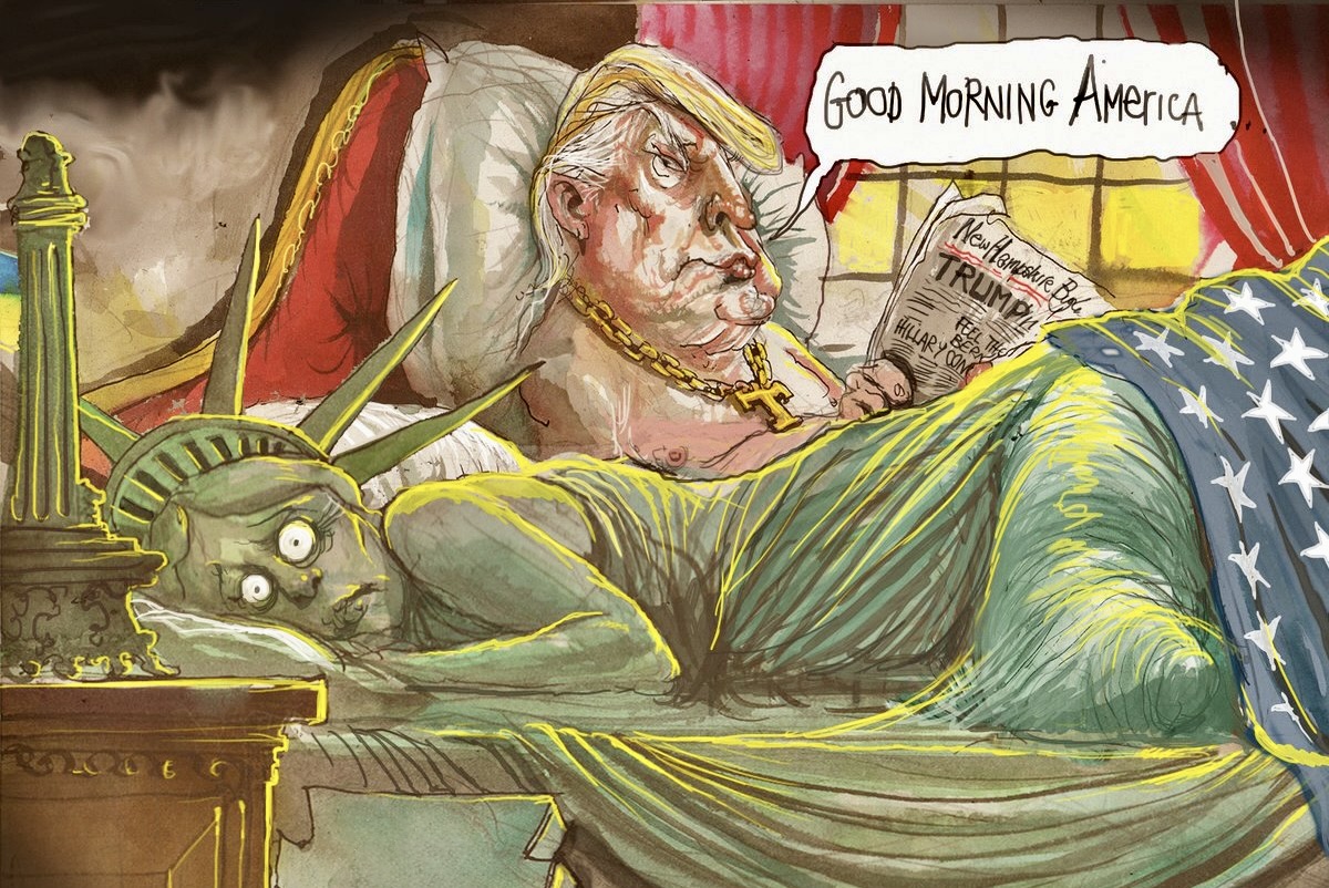 In de plaats: geraaskal over ‘the gold underneath our feet’, de olie dus, drill baby drill, ongeacht de enorme investeringen die de Amerikaanse industrie reeds maakt in de productie van elektrische batterijen; de baai van Mexico herdopen als provocatie, agressieve troepen aan de grens, miljoenen “gekken en criminelen” die hij terug zal sturen (waardoor de werkgelegenheid in de VS onder druk zal komen te staan door het wegvallen van evenzovele onderbetaalde werkkrachten op zoek naar een beter leven), de unieke opdracht hem aangereikt door de Calvinistische Oppergaai die ook een kogel langs zijn oor liet schampen om te benadrukken dat hij de Enige is die zijn land kan redden, om te eindigen met de boodschap dat hij een vredesapostel is – de speech van een waanzinnige.