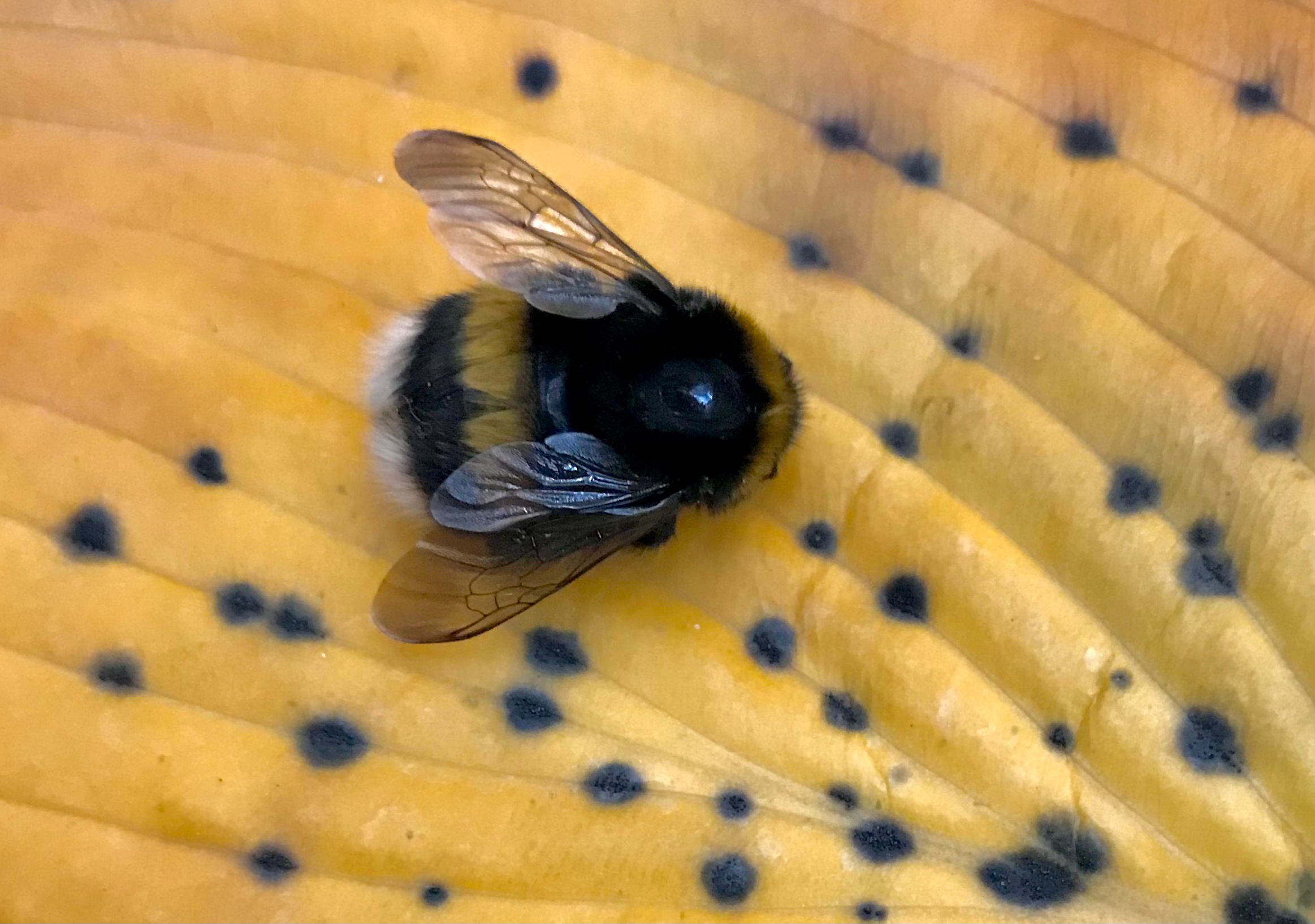En wat komt deze hommelkoningin hier bij doen? Ik heb ze nog enkele seconden horen brommen, maar toen hield het plots op. Onmiddellijk alle spinnenwebben nagekeken, maar niks ter zien, het bleef stil. Tot ik ze vandaag, bezig met m’n lichtjes, ineens als een dier-baar juweeltje dood op de grond zag liggen. Laatste lijn: nabijer kan ze mij niet zijn.
